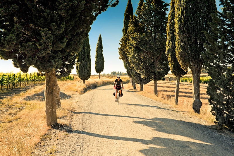 Toskania i Umbria to regiony górzysto – pagórkowate. Większość wycieczek rowerowych, jakie będziemy odbywać po okolicy, przebiega lokalnymi, wąskimi i krętymi drogami. Pokonując przygotowane przez nas trasy rowerowe, będzie można podziwiać typowo toskańskie krajobrazy: niekończące się intensywnie zielone winnice na silnie nasłonecznionych stokach. W takich warunkach dojrzewa winorośl używana do produkcji jednych z najpopularniejszych włoskich win takich jak Chianti czy Brunello. Teren pagórkowaty powoduje, że czasem trzeba będzie przycisnąć nieco mocniej na pedały, ale cały trud zostanie zrekompensowany przez długie, atrakcyjne krajobrazowo zjazdy w dół. W ciągu dnia zdarzy się czasem, że zjedziemy z drogi asfaltowej, aby przez chwilę pojechać rzadko uczęszczanymi, szerokimi i wygodnymi drogami szutrowymi. To dobra opcja dla osób ceniących sobie chwile absolutnej ciszy i spokoju.